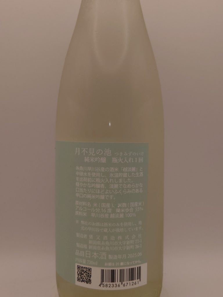 新潟県糸魚川市、早川谷に酒蔵を構える猪又酒造は、1890年創業の老舗蔵。付近には、春になると満水となる「清水池(しょうずいけ)」と呼ばれる小さな池がある。その池は、「早川郷」の藤の花が水面に映る月を覆ってしまうことから、「月不見の池(つきみずのいけ)」と呼ばれるようになったという。村人たちはその幻想的な景色のもとに集い、酒を酌み交わしてきた。まさにその風景を映すような、情緒豊かな銘柄である。