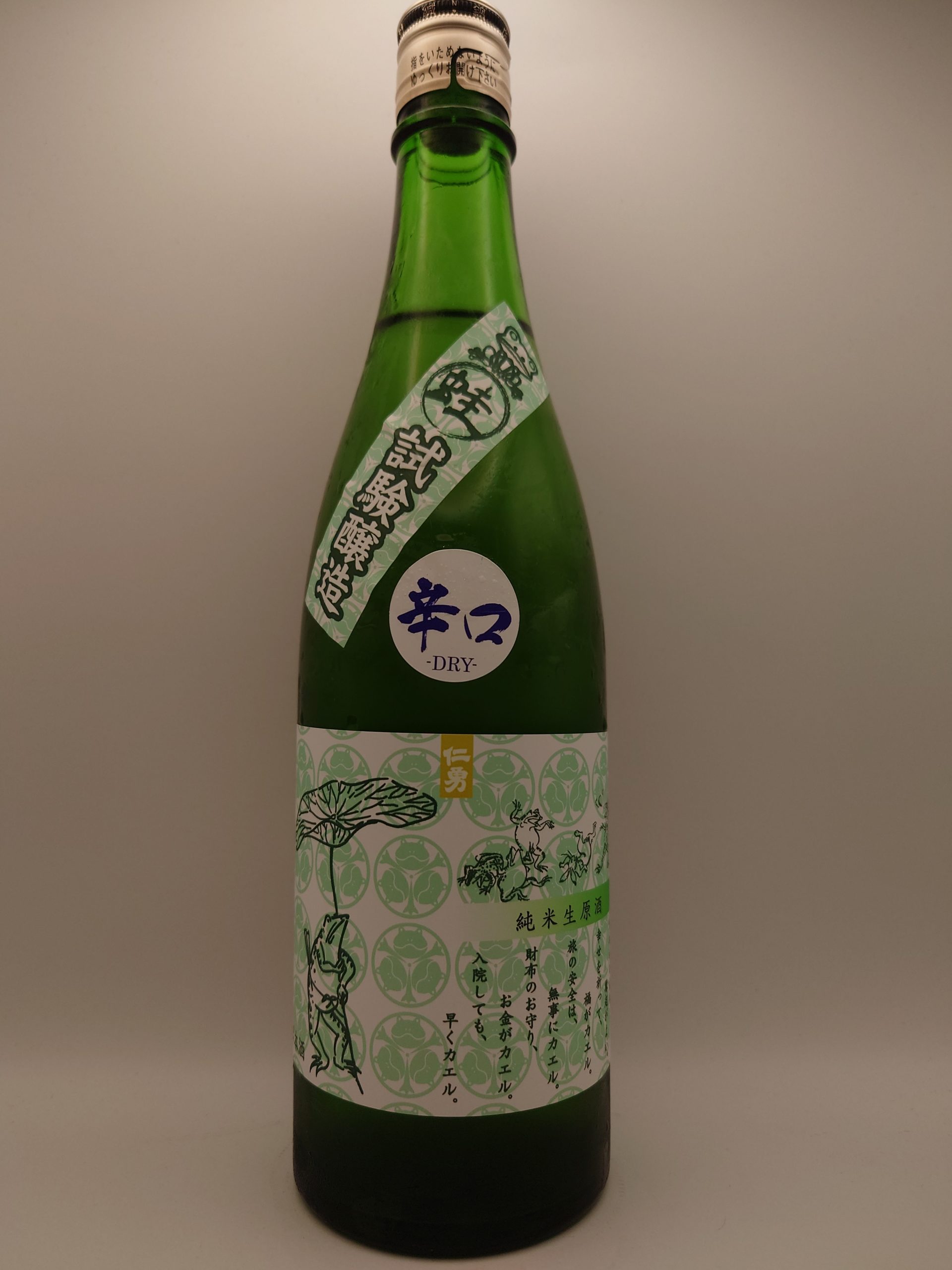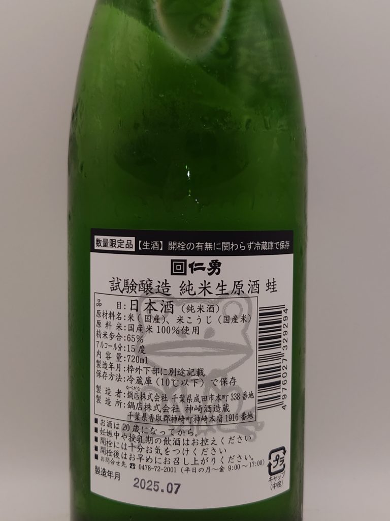 鍋店株式会社は、成田山新勝寺の参道にて、1689年より酒造りを営んできた老舗の酒蔵である。現在は醸造所を千葉県香取郡神崎町に移し、杜氏に頼らず、社員による一貫した酒造りを行っている。以前、この蔵元の銘柄「不動」を口にした際、その美味しさに深く感動した記憶がある。今回は、別銘柄「仁勇」の限定商品、試験醸造「蛙」を購入。酢酸イソアミルの香りを際立たせるため、極めて低温(約10℃)で長期間発酵させるという、こだわりの製法が採られている。