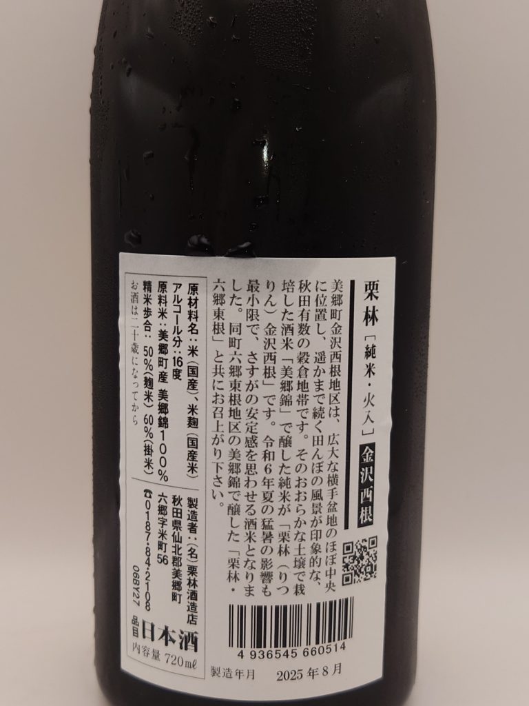 今回購入したのは、地元・美郷町産の美郷錦を亀山酵母で醸した「栗林 純米 美郷錦 金沢西根」である。ラベルの裏書には、六郷東根地区の美山錦との飲み比べが推奨されていた(今回は購入していない)。