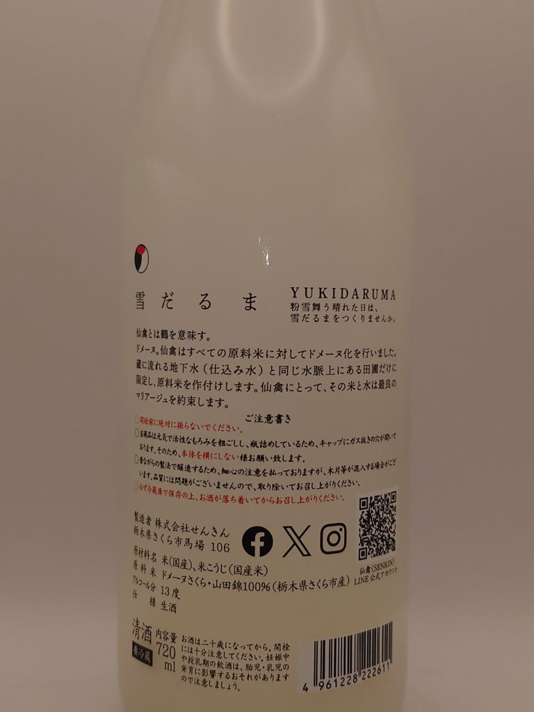 仙禽は、いつ飲んでも美味しい。蔵の創業は1806年(文化三年)にさかのぼる。「仙禽」とは仙界に棲む鶴を意味する。酒造りは徹底したこだわりを追求し、原料米は蔵の仕込み水と同じ水脈の田んぼで栽培する「ドメーヌ化」にいち早く取り組み、無農薬・無化学肥料による自然栽培米を前提としている。古代米「亀の尾」を中心に、山田錦や雄町なども栽培。特に「亀の尾」はコシヒカリやササニシキの祖先米であり、蔵独自に原原種を復活させたこだわりの酒米である。さらに江戸時代に確立された酒造技法を現代に蘇らせ、全量生酛造り、酵母無添加(天然酵母)醸造、木桶仕込みなど、手間のかかる自然派の手法を重視している。