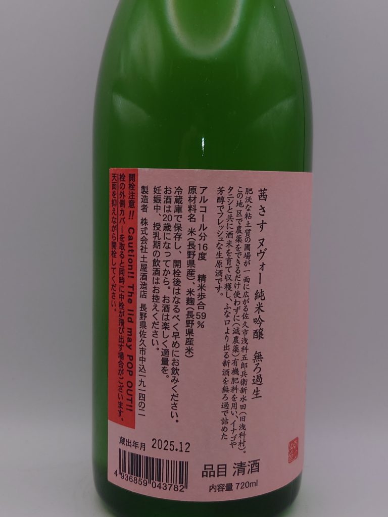 今回手に取った「茜さす ヌヴォー」は、浅科地区・五郎兵衛新田(特A級の産地)で収穫された減農薬栽培米を使った冬季限定酒だ。新米の瑞々しさをそのまま閉じ込めた無ろ過生酒で、開栓した瞬間から季節の息吹が立ち上る。