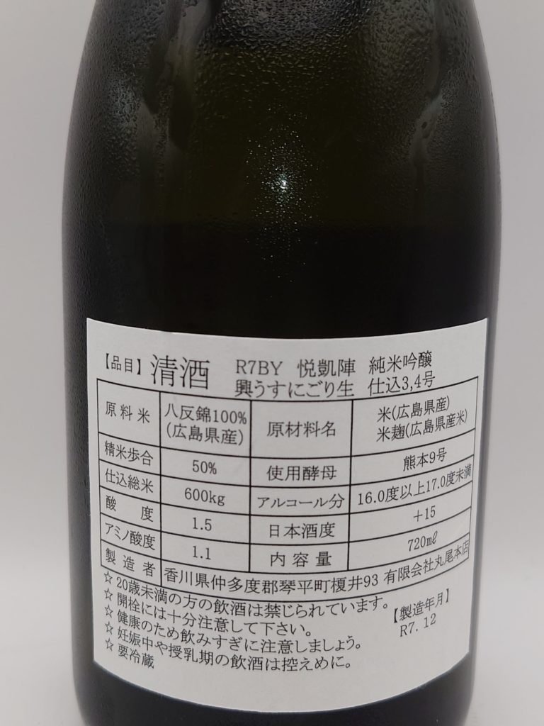 今回は、広島県産八反錦を使用した新酒「悦凱陣 純米吟醸 興(こう) うすにごり生」を購入した。この酒は、杜氏・丸尾忠興氏の名から一文字を取った「興」を冠し、毎年“新酒第一弾”としてリリースされる特別な一本である。八反錦を50%まで磨き、熊本9号酵母で仕込んだ純米吟醸で、うすにごり表記ながら実際にはほぼ澄んだ状態で出荷される年が多い。