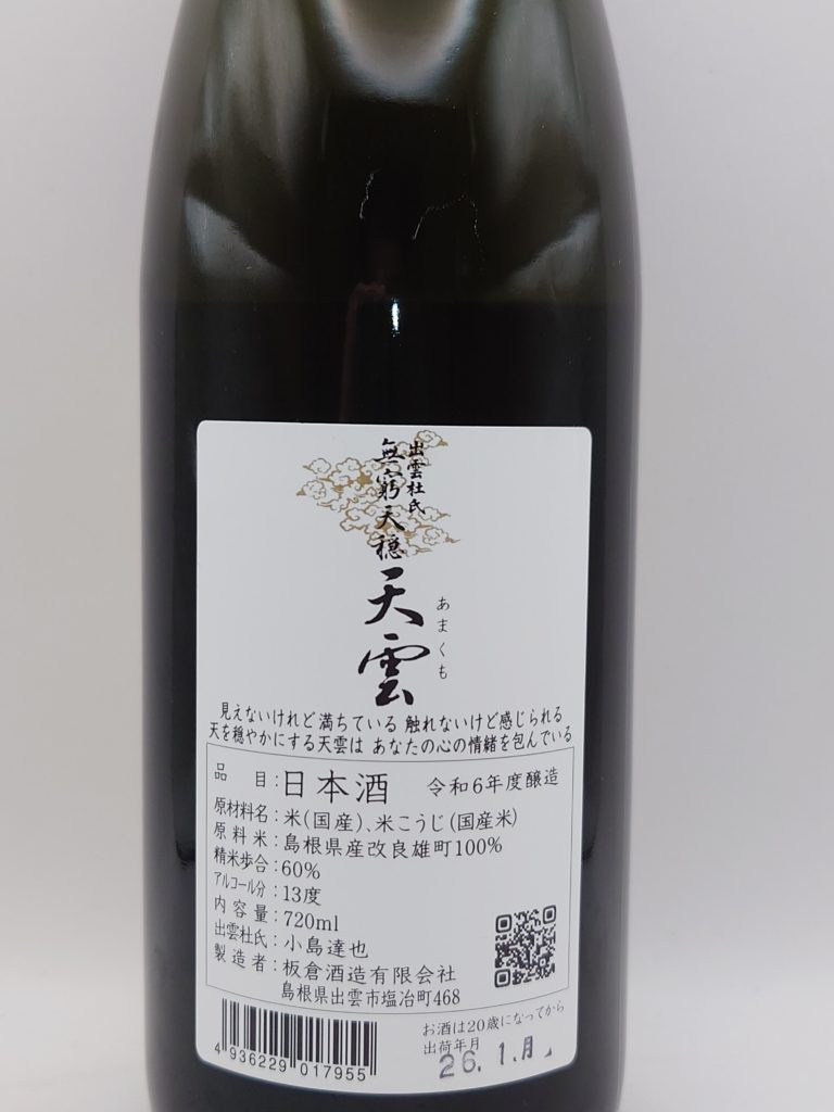 今回は、その中から島根県産改良雄町を60%まで磨いた「天雲 生酛純米吟醸」を購入してみた。