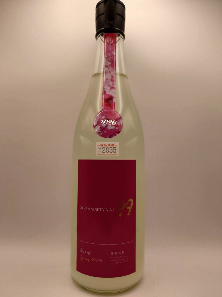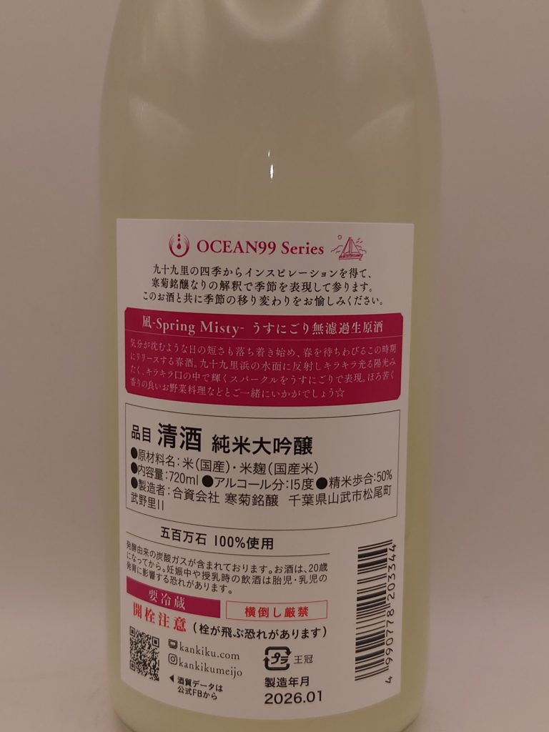 今回手に取ったのは、寒菊銘醸の人気シリーズ「OCEAN99」の春限定酒、「OCEAN99 凪 Spring Misty」。“OCEAN99”とは、蔵のすぐそばに広がる九十九里浜海岸を意味し、“海の99%はまだ知られていない”というコンセプトとともに、外房の海が持つ静けさ・透明感・奥行きを酒に映し取ろうとするシリーズである。「凪 Spring Misty」は、春の海に漂う“凪”の静けさと、春霞のような柔らかさをイメージして造られた一本だ。