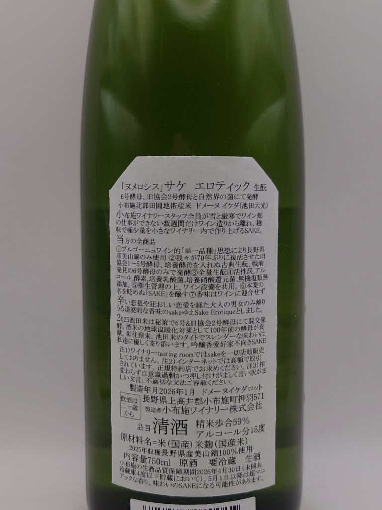 2025池田米を、戦前の6号酵母と旧協会2号酵母で混成発酵。生酛による醸造をワイン設備と共用しながら仕上げているという。