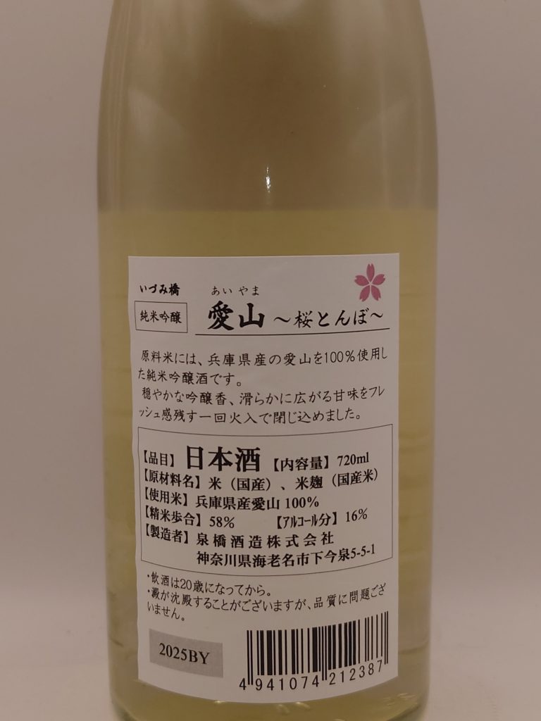 今回購入したのは、「酒米のダイヤモンド」とも称される愛山を使用した一本。ラベルには、同蔵の象徴ともいえるトンボをモチーフとした意匠が描かれており、春の季節酒では満開の桜が咲く山野を舞うトンボがあしらわれている。自然と共生する蔵の思想を感じさせる、印象的なデザインである。