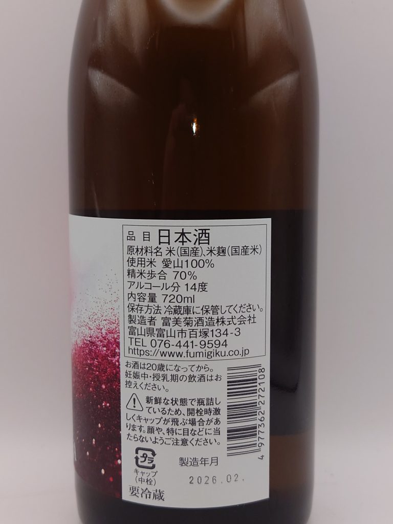 その味わいは、白ブドウを思わせる華やかで瑞々しい吟醸香が香り立ち、心地よい甘さと透明感のある酸味が見事に調和し、口内に喜びを与える。しぼりたて特有のフレッシュなガス感とともに、愛山らしいやわらかく上品な旨味が味蕾に染み入り、終盤にはほのかな苦味がアクセントとなり、感動的な余韻を残しながら綺麗に喉に落ちてゆく。酒米のダイヤモンド「愛山」が富美菊酒造の高い技術力により、見事に結実した完成度の高い一本。単体でも十分に楽しめるが、繊細な味付けの料理と合わせることで、その魅力はさらに引き立つ。寒さの残る季節の中に春の気配を感じながら味わいたい、完成度の高い新酒である。